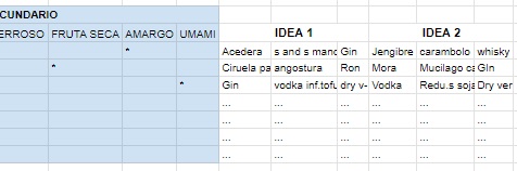 Y luego con cada perfil voy buscando un ingrediente que además haga match con los otros ingredientes de cada cóctel (ver el siguiente). De esas ideas supuestas hago más o menos dos por cada uno, porque habrán algunos que no queden como esperamos.